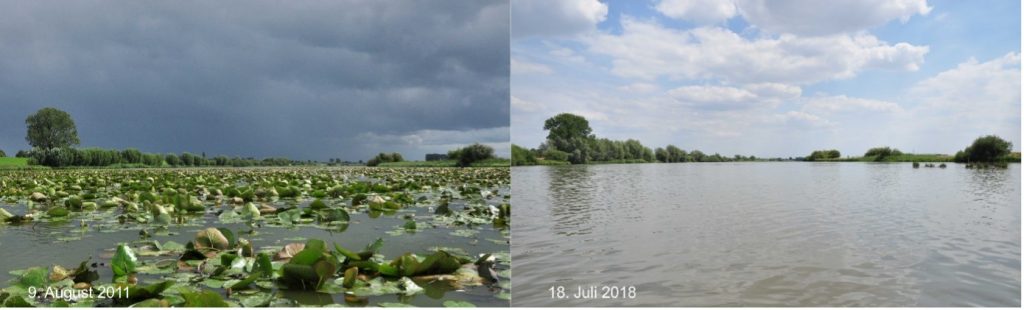 Zielsetzung: Bereits zwischen 2011 und 2018 ist der Bestand der Gelben Teichrose (Nuphar lutea) und Weißer Seerose (Nymphaea alba) auf dem Bienener Altrhein drastisch zurückgegangen. Damit fehlen die beschattende und kühlende Wirkung der Blätter bei hohen Temperaturen sowie die das Sediment festigende Wirkung der Rhizome. Zudem ist der Altrhein stärker dem Wellenschlag ausgesetzt. Mögliche Ursachen für den Rückgang der Schwimmblattvegetation sind einerseits eine zu hohe Cypriniden-Population (Karpfen, Brassen) und andererseits der Einfluss großer Wasservögel.