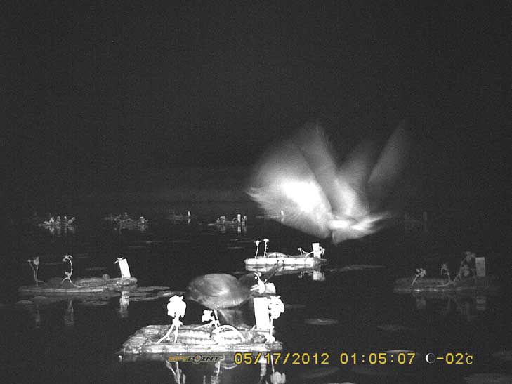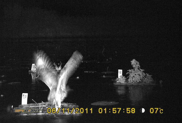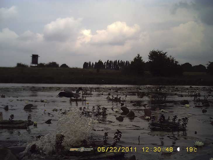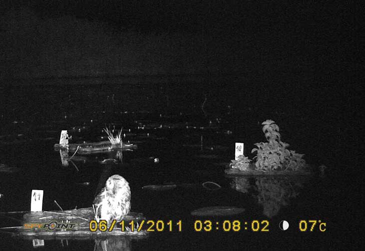 Mit Hilfe der Fotofallen konnten im Lauf der Jahre die Waldohreule als Prädator der Küken nachgewiesen werden. Diese nachtaktive Eule erbeutete innerhalb von wenigen Stunden mehr als ein halbes Dutzend Küken. Auch die Blässralle konnte „ertappt“ werden, als sie sich über die Gelege hermachte. Innerhalb einer Nacht zerstörte sie sieben Gelege, wobei unklar ist, ob sie die Eier nur zerstört oder auch gefressen hat. Blässrallen brüten ebenfalls egelmäßig auf den Nistflößen der Trauerseeschwalbe und sind teilweise sehr territorial. Es ist dankbar, dass sie die Eier nur zerstört hat, um ihr Revier zu verteidigen.