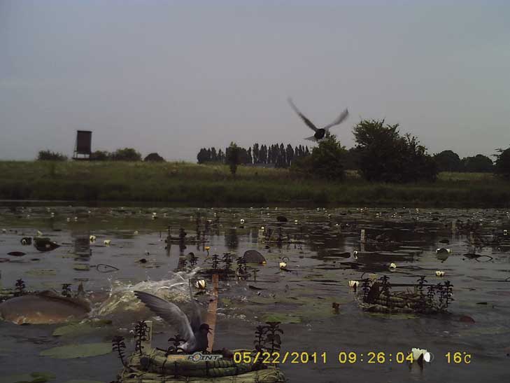 Eine der erstaunlichsten Entdeckungen für den Verlust von Eiern kam aber aus einer ganz anderen Ecke – hierfür waren nämlich Fische verantwortlich. Genauer gesagt, laichende Karpfen. Karpfen legen ihre Eier an Wasser- und Schwimmblattpflanzen ab, die die Nistflöße umgeben. Es ist zudem möglich, dass sie die grünen Nistflöße ebenfalls für Schwimmblattpflanzen halten. Beim Laichvorgang erzeugen die Karpfen mit ihrer Schwanzflosse, einen derartig starken Wellenschlag, dass hierdurch in früheren Jahren mit Sicherheit zahlreiche Gelege von den Nistflößen gespült wurden. Als Reaktion auf die Erkenntnis, dass Wellenschlag (wind- oder karpfenbedingt) zu hohen Gelegeverlusten führen kann, wurden alle Nistflöße mit einem so genannten Eirollschutz ausgestattet. Seit Einführung dieser Maßnahme ist der Bruterfolg der Trauerseeschwalbe nicht mehr unter die bestandserhaltende Schwelle gesunken, meist lag er sogar darüber. Dieses Beispiel zeigt, wie wichtig ökologische Grundlagenforschung sein kann, um konkrete Artenschutzmaßnahmen zu optimieren. Erst ein breites Wissen über eine Art, kann zu einem besseren Verständnis von Zusammenhängen und schließlich zu geeigneten Schutzmaßnahmen führen!