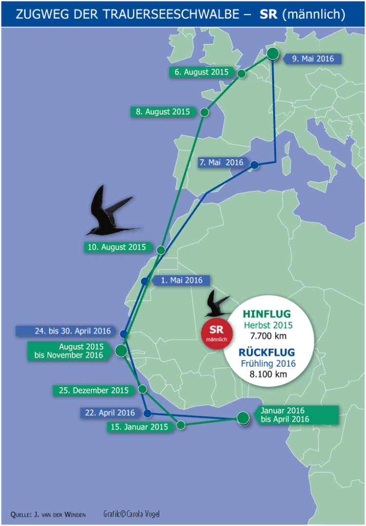 Im Jahr 2016 wurden dann tatsächlich sieben der zehn im Vorjahr beringten Trauerseeschwalben wieder in den Brutkolonien am Unteren Niederrhein entdeckt. Das entspricht eine Rückkehrrate von 70% und zeigt, dass die Trauerseeschwalbe eine hohe Brutplatztreue aufweist. Von den sieben Trauerseeschwalben konnten sechs gefangen und der Geolokator abgenommen und ausgewertet werden. Hierdurch gelang es, von zwei Trauerseeschwalben die vollständige Zugroute zu erstellen. Die anderen Datensätze waren leider nur unvollständig oder fehlerhaft.