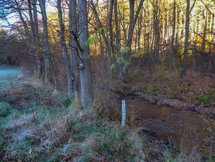 Der ökologisch noch interessantere Bereich liegt direkt am Gewässer. Hier wird es auf Grund der Topographie möglich sein, dem Bach ggf. weiteren Raum durch einen Tot- oder Seitenarm zu geben. Über sämtliche Grundstücke zwischen der Kläranlage und der nächsten Wohnbebauung ist ein breiter werdender Streifen, der nur gering über dem Bachniveau ist.