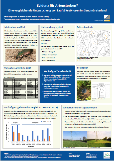 Die Abnahme wurde auf allen vier Probeflächen festgestellt. Der Rückgang war auf konventionell bewirtschafteten Flächen deutlich stärker als auf einer ökologischen. Allerdings waren Individuen- und Artenzahl der Laufkäfer in allen Fällen in 2019 geringer als 1999.
