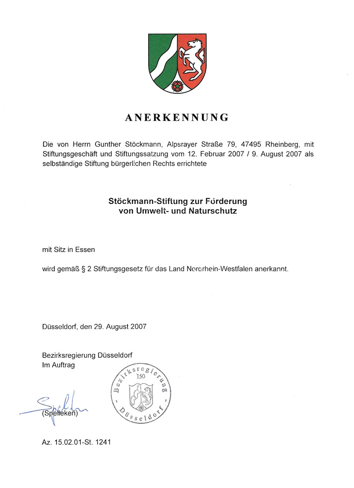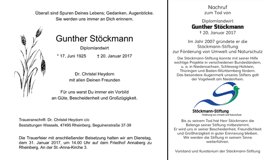 Nach Aufgabe des wirtschaftlichen Betriebes gründete Gunther Stöckmann 2007 seine Stiftung, in die er beträchtliche Teile seines Vermögens einbrachte, und die sich vor allem um Umwelt und Naturschutzbelange kümmern sollte. Dem Stifter lagen besonders Maßnahmen am Herzen, die der Förderung der Vogelwelt dienen. Nach einem Herzinfarkt berief Herr Stöckmann Frau Dr. Christa Heydorn im März 2014 zur ersten Vorsitzenden seiner Stiftung. Im Laufe der Jahre erlitt er mehrere Schlaganfälle, so dass er auf die Unterstützung und Führsorge von Frau Dr. Heydorn angewiesen war. Sie berichtete ihm regelmäßig vom Fortgang der Stiftung.